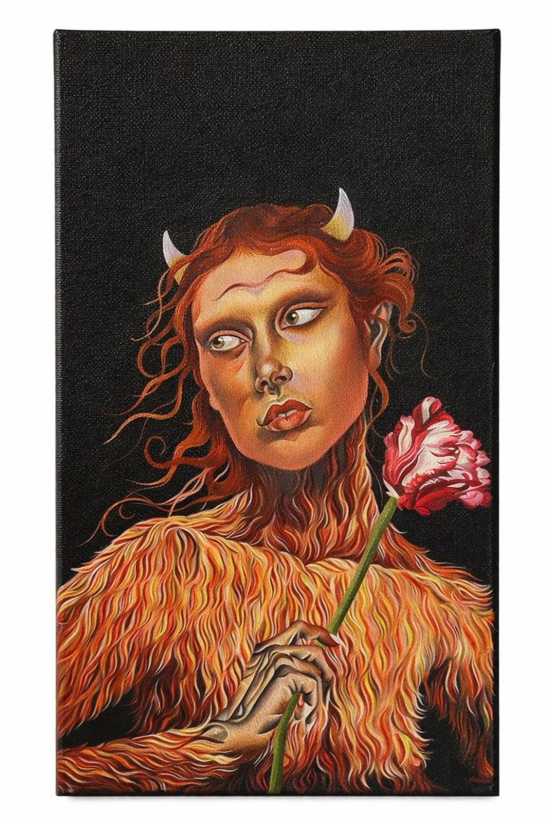 Jessie Makinson (b. 1985, based in London) creates intricate, jewel-like paintings that blend historical and folkloric environments with fantastical social portraiture. Her scenes draw on literary and mythological networks, folding together references such as 18th-century brothel imagery, Georgian parlour games, and contemporary eco sci-fi into unstable, funhouse-mirror worlds.