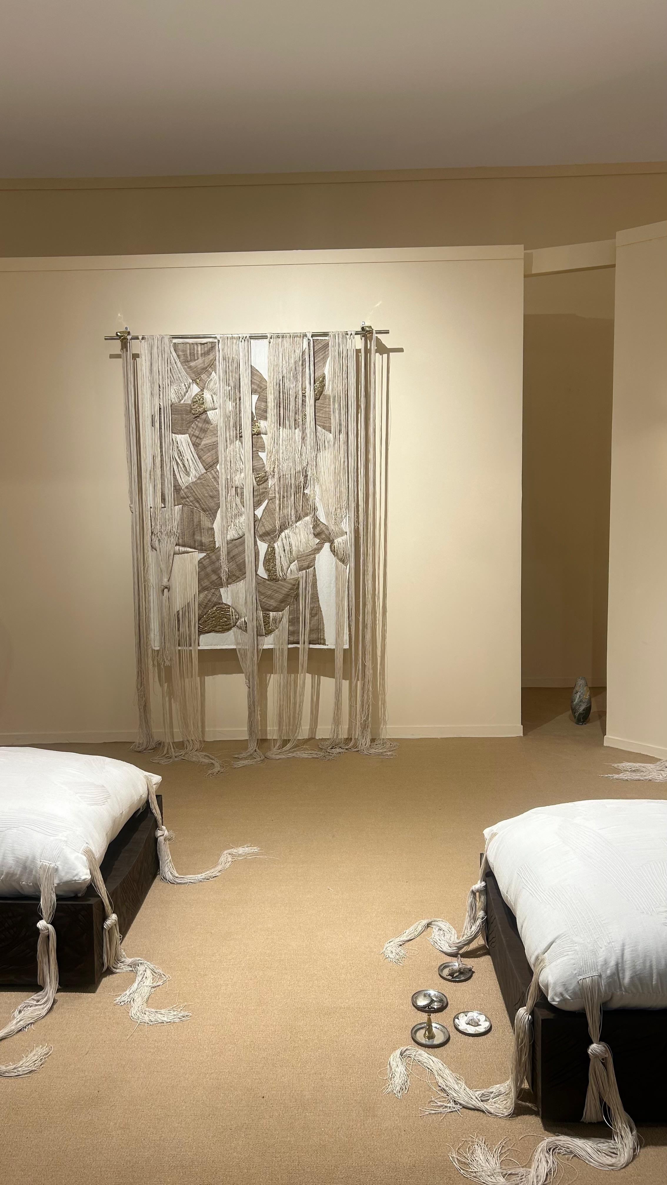 The project’s texture deepened through its making: Gastini’s “The Bond” involved textile and embroidered works developed in collaboration with Amal Embroideries, pushing embroidery beyond surface into structure and volume.